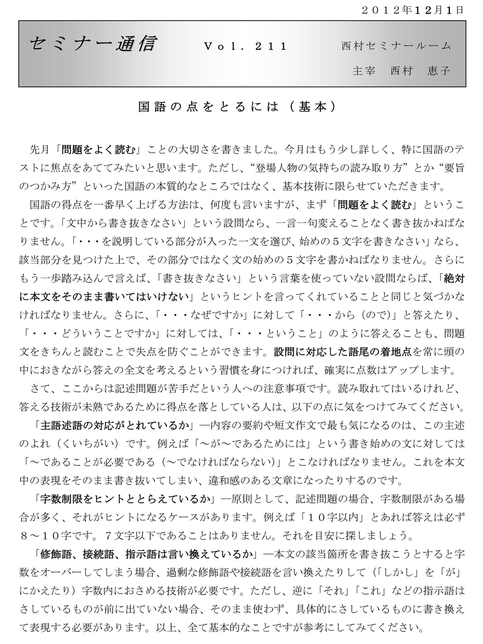 セミナー通信211号「国語の点をとるには(基本)」